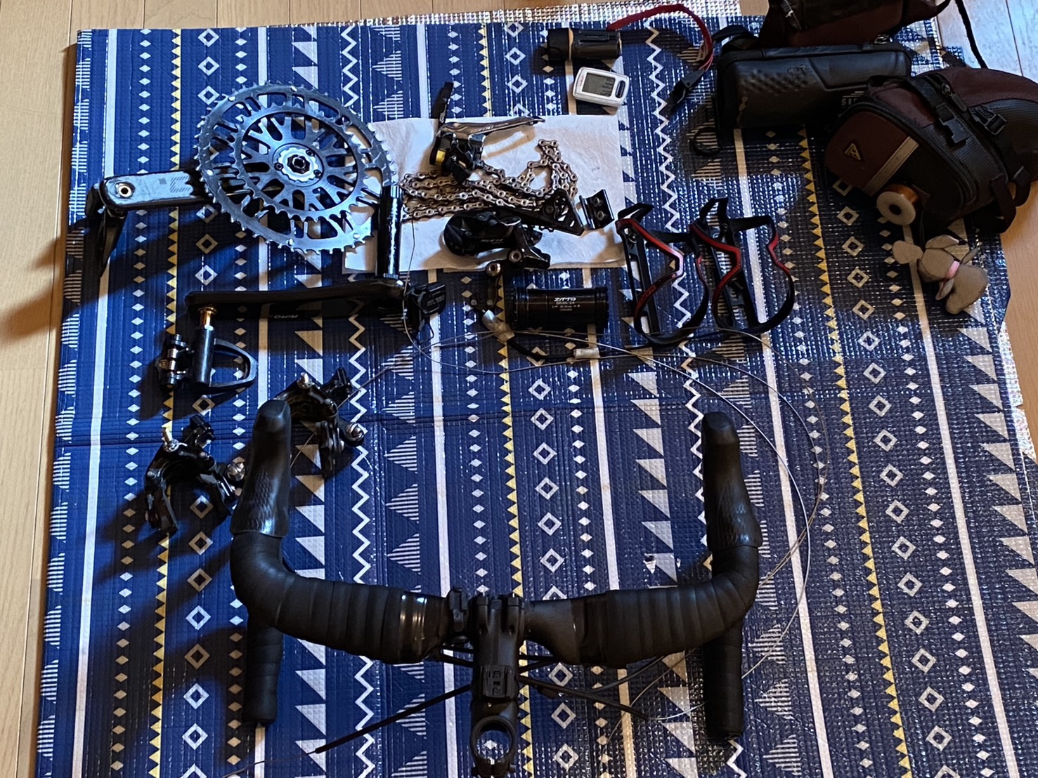 カーボンロードが少し汚れてきた。傷防止シールや塗装欠けを直そうと、全ばらし。1週間かけて夜ちょこちょこ作業していく。